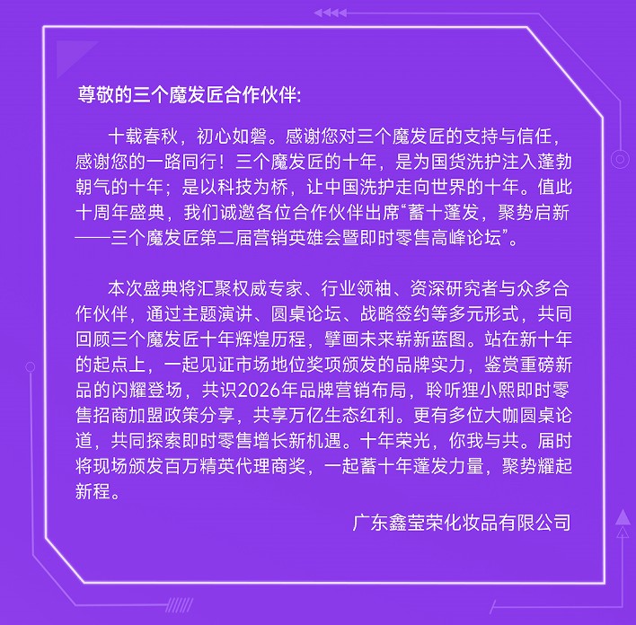 值此十周年之际,三个魔发匠以“蓄十蓬发·聚势启新”为主题,打造一场集战略发布、行业交流、荣耀表彰、温情献礼于一体的年度盛典,于2026年1月9日-11日在广州白云国际会议中心启幕,诚邀各界合作伙伴共赴十年之约,共拓全新征程。